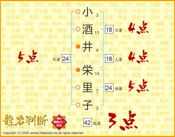 小(3画)酒(11画)井(4画) 栄(14画)里(7画)子(3画)