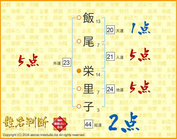 飯(13画)尾(7画) 栄(14画)里(7画)子(3画)