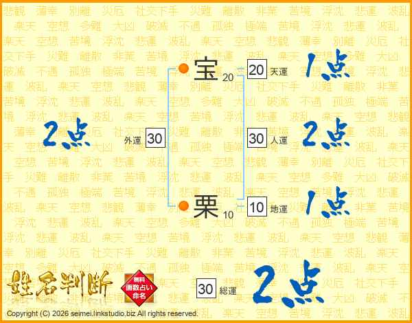 生活面を象徴する運勢です。外部から受ける影響力を表し、結婚運、家庭運や職場、環境への順応性を表します。総運から人運を引いた画数。姓や名が1文字の場合を除く。