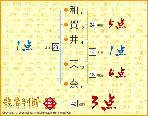 和(8画)賀(12画)井(4画) 栞(10画)奈(8画)
