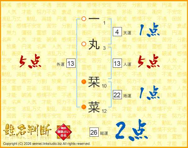 生活面を象徴する運勢です。外部から受ける影響力を表し、結婚運、家庭運や職場、環境への順応性を表します。総運から人運を引いた画数。姓や名が1文字の場合を除く。