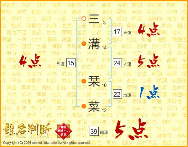 生活面を象徴する運勢です。外部から受ける影響力を表し、結婚運、家庭運や職場、環境への順応性を表します。総運から人運を引いた画数。姓や名が1文字の場合を除く。