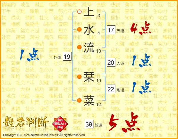 上(3画)水(4画)流(10画) 栞(10画)菜(12画)