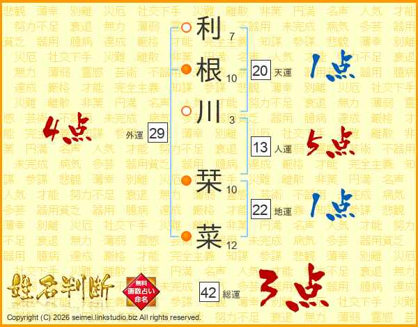 利(7画)根(10画)川(3画) 栞(10画)菜(12画)