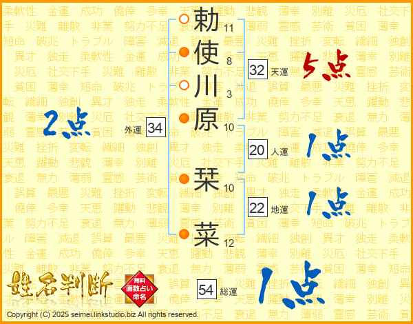 勅(11画)使(8画)川(3画)原(10画) 栞(10画)菜(12画)