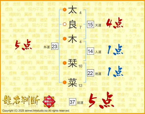 太(4画)良(7画)木(4画) 栞(10画)菜(12画)
