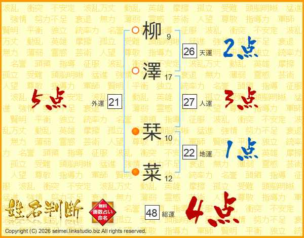 柳(9画)澤(17画) 栞(10画)菜(12画)