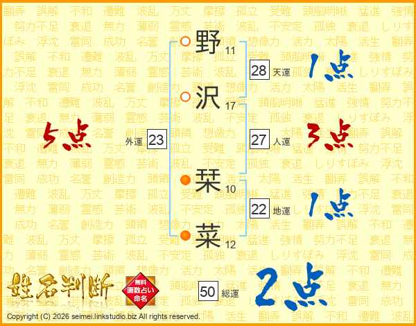 野(11画)沢(17画) 栞(10画)菜(12画)