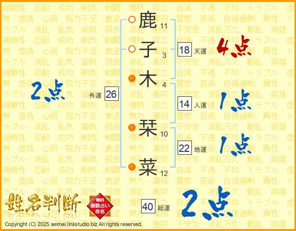 鹿(11画)子(3画)木(4画) 栞(10画)菜(12画)