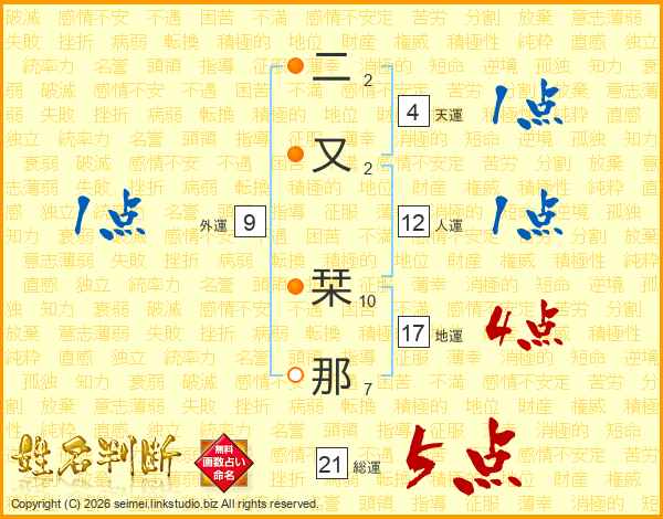 二又栞那さんの総運は21画の5点!