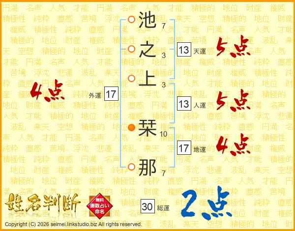 生活面を象徴する運勢です。外部から受ける影響力を表し、結婚運、家庭運や職場、環境への順応性を表します。総運から人運を引いた画数。姓や名が1文字の場合を除く。