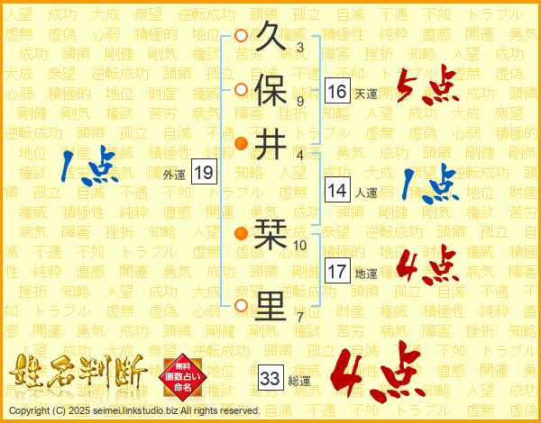 久(3画)保(9画)井(4画) 栞(10画)里(7画)