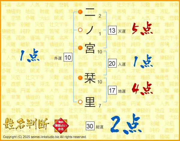 二(2画)ノ(1画)宮(10画) 栞(10画)里(7画)