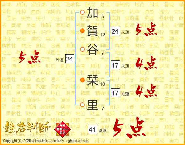 加(5画)賀(12画)谷(7画) 栞(10画)里(7画)