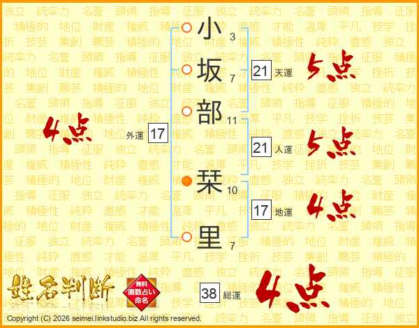 小坂部栞里さんの総運は38画の4点!