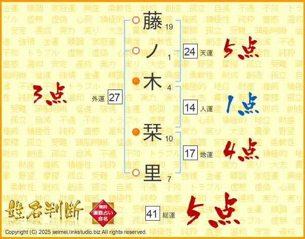 藤(19画)ノ(1画)木(4画) 栞(10画)里(7画)