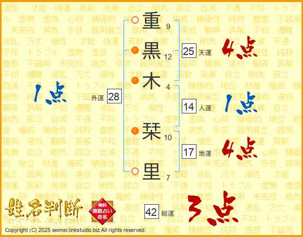 重(9画)黒(12画)木(4画) 栞(10画)里(7画)