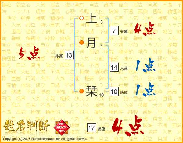 生活面を象徴する運勢です。外部から受ける影響力を表し、結婚運、家庭運や職場、環境への順応性を表します。総運から人運を引いた画数。姓や名が1文字の場合を除く。