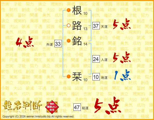 家系が持つ宿命的な運勢を表します。祖先から受け継いだ苗字ですので自分の力が及びません。家柄を象徴します。苗字の合計画数。