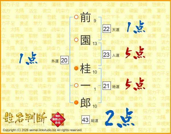 前(9画)園(13画) 桂(10画)一(1画)郎(10画)