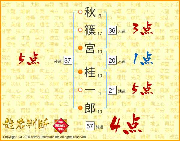 秋(9画)篠(17画)宮(10画) 桂(10画)一(1画)郎(10画)