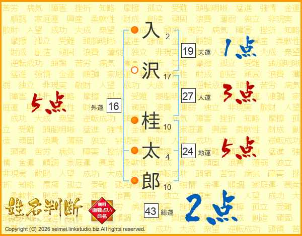 入(2画)沢(17画) 桂(10画)太(4画)郎(10画)