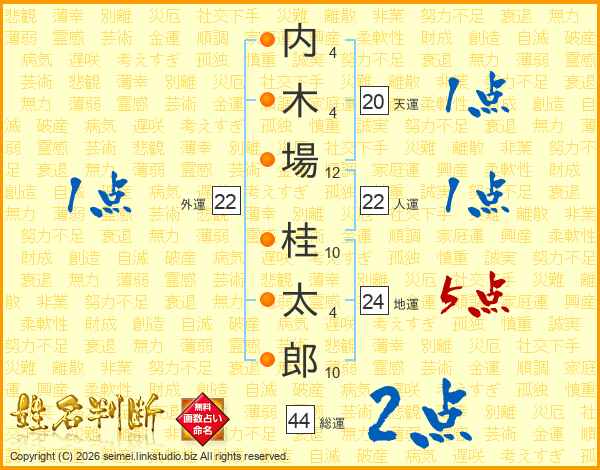 内(4画)木(4画)場(12画) 桂(10画)太(4画)郎(10画)