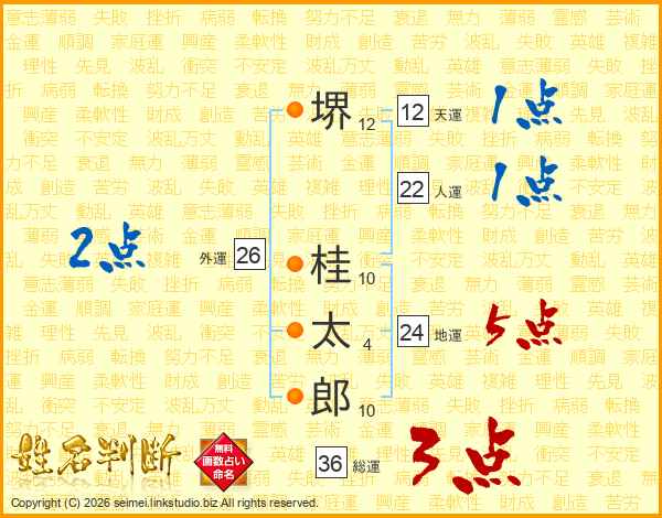 堺(12画) 桂(10画)太(4画)郎(10画)