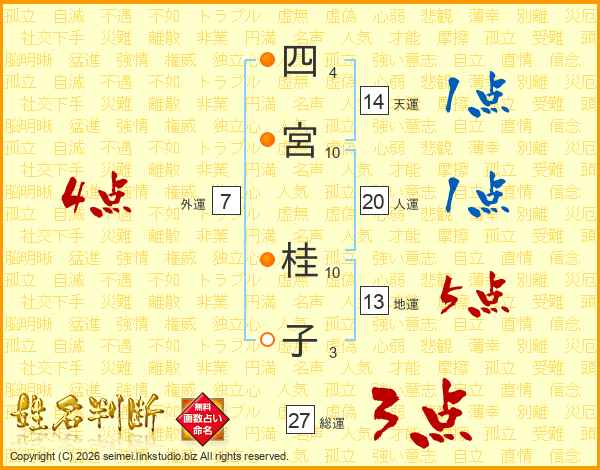 生活面を象徴する運勢です。外部から受ける影響力を表し、結婚運、家庭運や職場、環境への順応性を表します。総運から人運を引いた画数。姓や名が1文字の場合を除く。