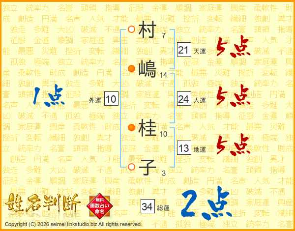 村(7画)嶋(14画) 桂(10画)子(3画)