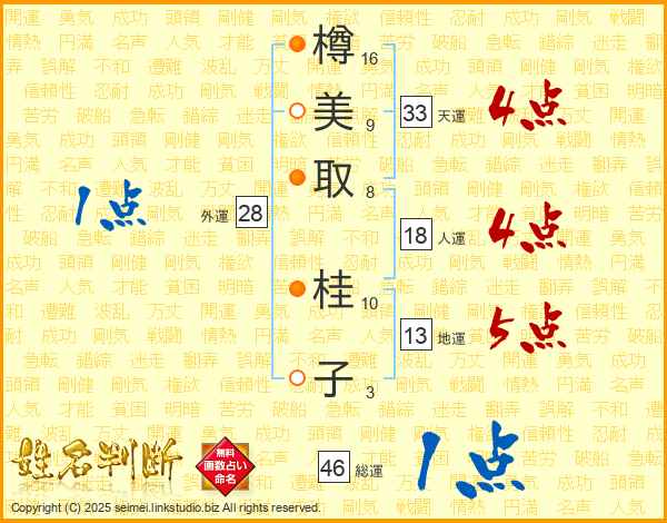 樽(16画)美(9画)取(8画) 桂(10画)子(3画)