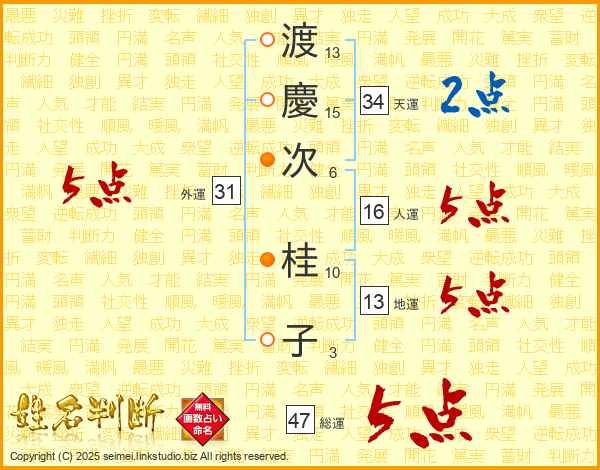 渡(13画)慶(15画)次(6画) 桂(10画)子(3画)