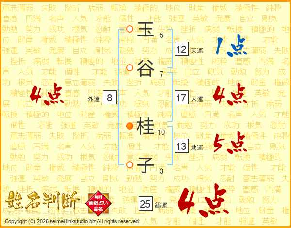 玉(5画)谷(7画) 桂(10画)子(3画)