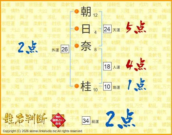 朝(12画)日(4画)奈(8画) 桂(10画)