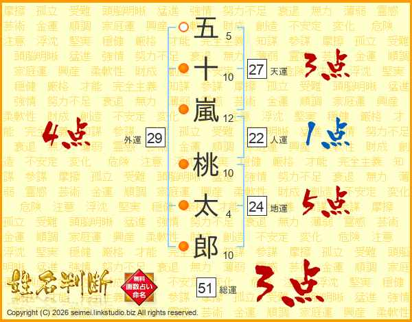 五(5画)十(10画)嵐(12画) 桃(10画)太(4画)郎(10画)