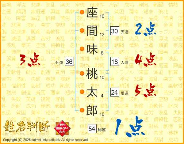 座(10画)間(12画)味(8画) 桃(10画)太(4画)郎(10画)