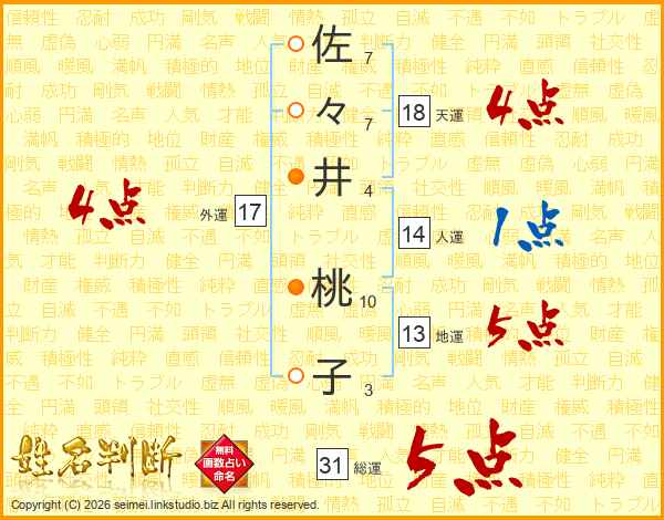 佐(7画)々(7画)井(4画) 桃(10画)子(3画)