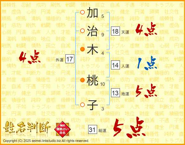 加(5画)治(9画)木(4画) 桃(10画)子(3画)