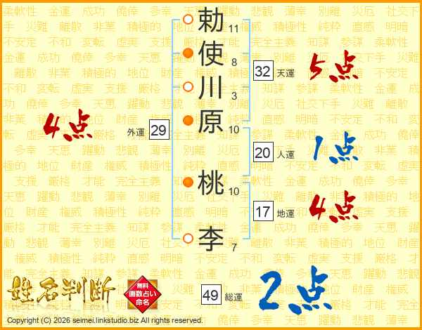 勅(11画)使(8画)川(3画)原(10画) 桃(10画)李(7画)