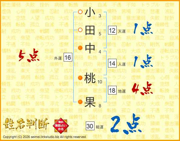 生活面を象徴する運勢です。外部から受ける影響力を表し、結婚運、家庭運や職場、環境への順応性を表します。総運から人運を引いた画数。姓や名が1文字の場合を除く。