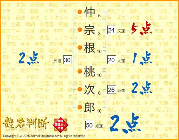 仲(6画)宗(8画)根(10画) 桃(10画)次(6画)郎(10画)