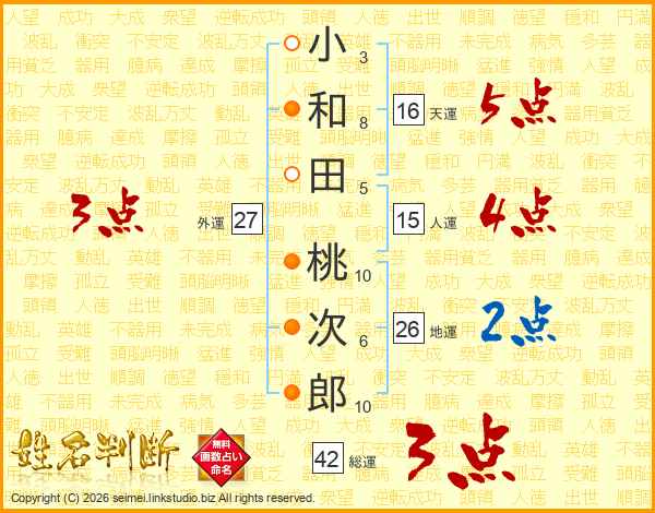 小(3画)和(8画)田(5画) 桃(10画)次(6画)郎(10画)