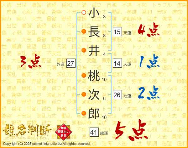 小(3画)長(8画)井(4画) 桃(10画)次(6画)郎(10画)
