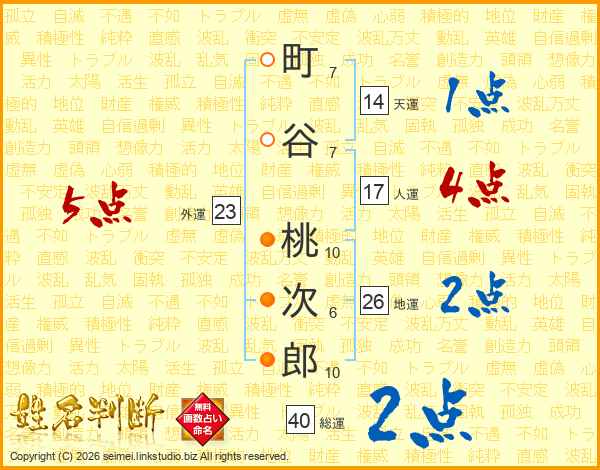 町(7画)谷(7画) 桃(10画)次(6画)郎(10画)