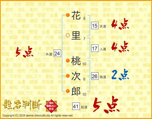 花(8画)里(7画) 桃(10画)次(6画)郎(10画)