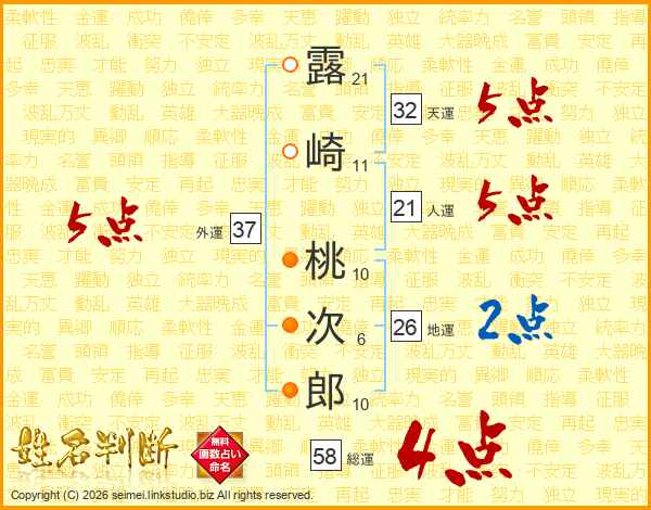 露(21画)崎(11画) 桃(10画)次(6画)郎(10画)