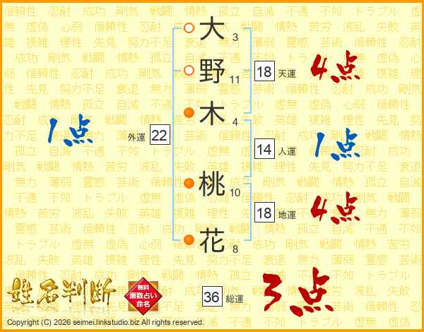 大(3画)野(11画)木(4画) 桃(10画)花(8画)