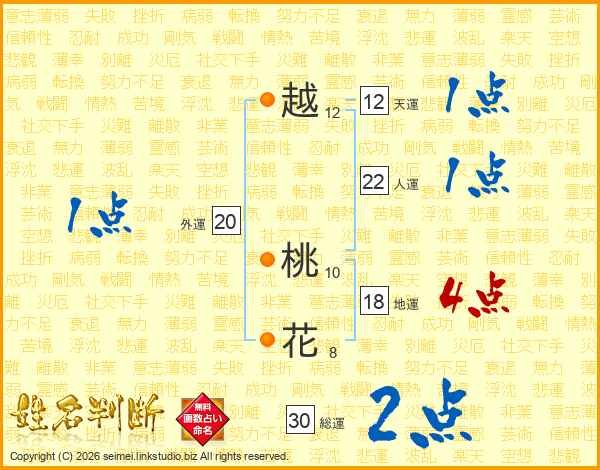生活面を象徴する運勢です。外部から受ける影響力を表し、結婚運、家庭運や職場、環境への順応性を表します。総運から人運を引いた画数。姓や名が1文字の場合を除く。