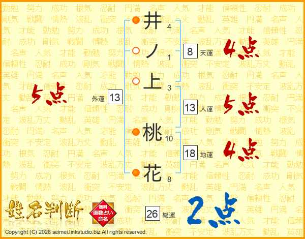 井(4画)ノ(1画)上(3画) 桃(10画)花(8画)