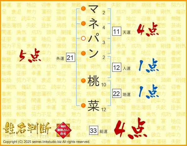 マ(2画)ネ(4画)パ(3画)ン(2画) 桃(10画)菜(12画)